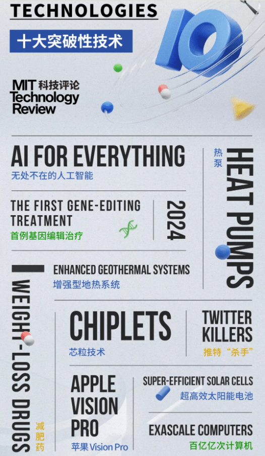 最近,《麻省理工科技评论》(MIT Technology Review)利用敏锐“嗅觉”挖掘出了那些有望对世界产生真正影响的、有前途的技术,并正式列入2024年“十大突破性技术”榜单(10 Breakthrough Technologies 2024,阅读相关文章请点此处)。入围技术包括无所不在的人工智能(AI for everything)、超高效太阳能电池(Super-efficient solar cells)、热泵(Heat pumps)、芯粒技术(Chiplets)……