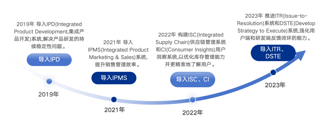小米陆续导入了多套先进的管理体系,构建起以IPD(集成产品开发)为核心,并由IPMS(市场与销售)、ISC(供应链)、CI(用户洞察)、ITR(问题解决),以及DSTE(战略执行)等组成的系统化管理架构,覆盖从战略制定、产品开发到市场落地、用户反馈的全过程闭环。
